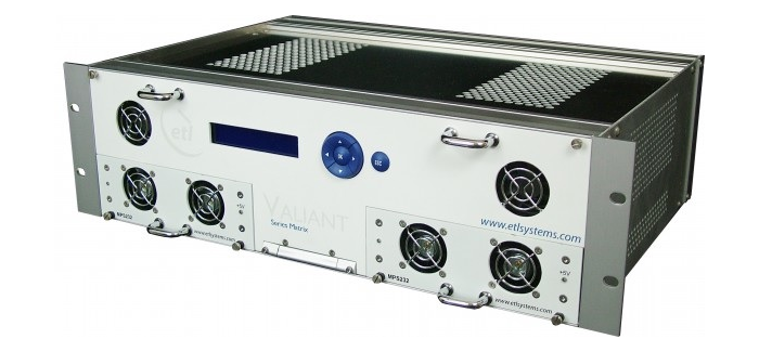 The V-series matrix range, all designed and built at ETL headquarters in the UK, includes the NEW 16×32 Valiant Matrix, 128×128 Vulcan Matrix Router, the 64×64 Vortex Matrix Router and the 16×16 Victor Matrix. All of the V-series matrices (except the Victor Matrix) have hot-swap of RF elements from front or rear of unit, for reliability and peace of mind, so RF cables and connectors do not have to be removed whilst the unit is in service.