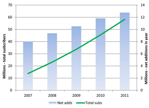 Figure 1 – Global IPTV subscribers and net adds – Q4 2007 to Q4 2011